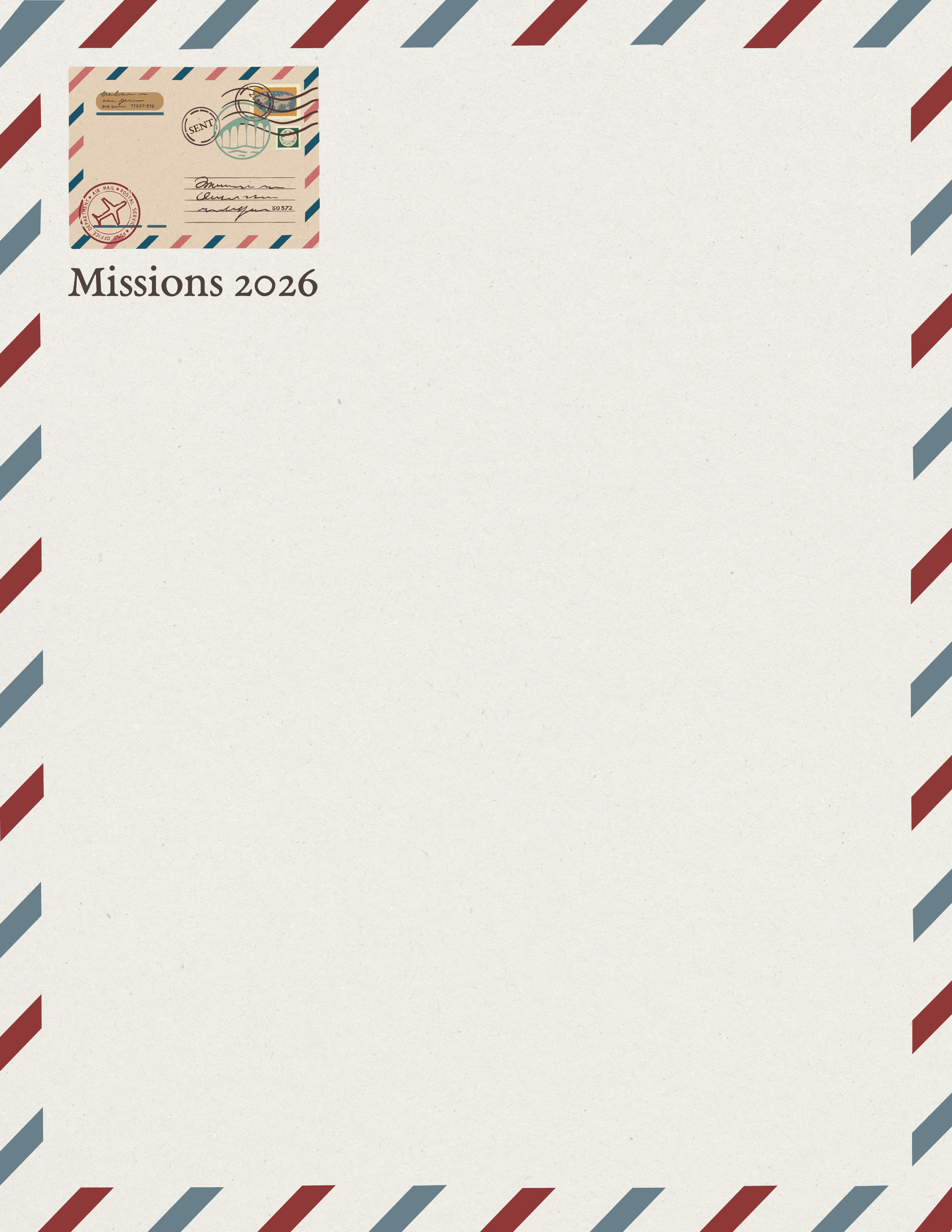 When missionaries were first sent out from the early church, the only way to communicate long distance was through a sent letter. Corresponding this way was very costly, yet invaluable for connection and mutual encouragement in Christ and His mission. Two thousands years later, all of us are invited into the continuation of this same mission, needing the very same connection and encouragement. To that end, read freshly written letters from our missionaries to us (available online and printed copies in lobby). Additionally, let’s write letters to our various missionaries! Find missions themed letter templates in the lobby or use your own paper. Letter drop off in the mailbox posted in the lobby will be sent to our missionaries for their encouragement.