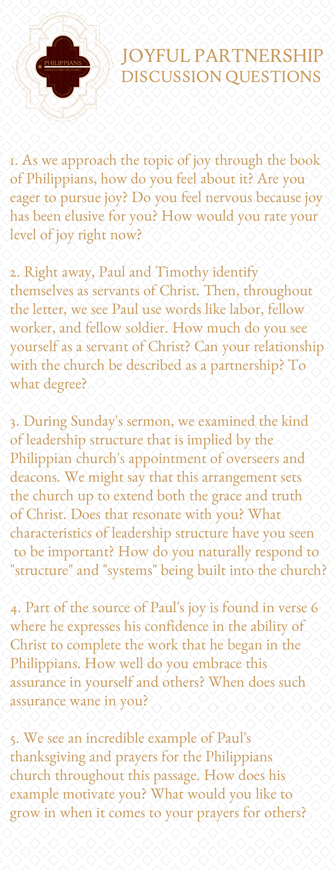 The book of Philippians is about joy, but that joy is found in the midst of partnership. In this introduction to the letter, we see Paul's incredible partnership with the Philippian church which led to abundant affection and joy.