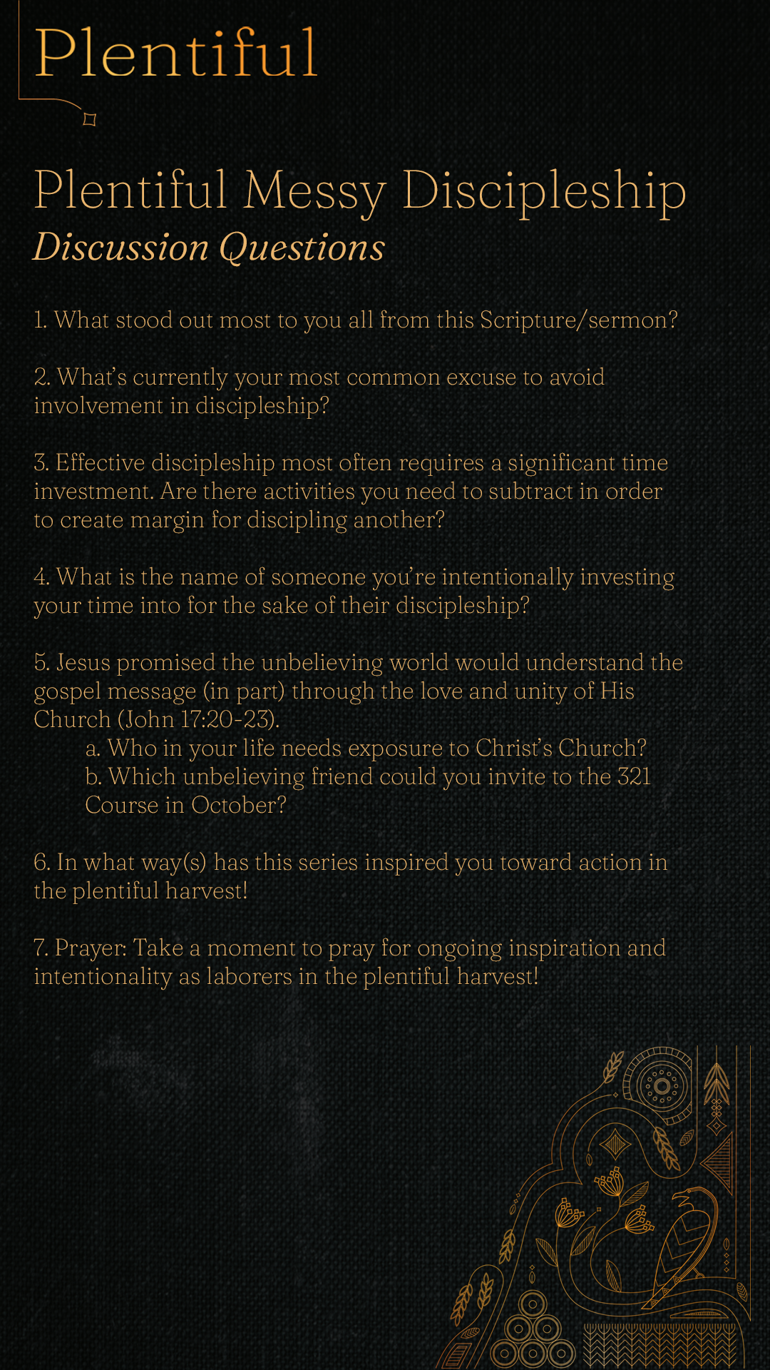 A plentiful harvest includes evangelism and the messy work of discipleship. Looking at Christ's Great Commission, let's seek fresh discipleship instruction and inspiration to overcome every harvest-hindering excuse.