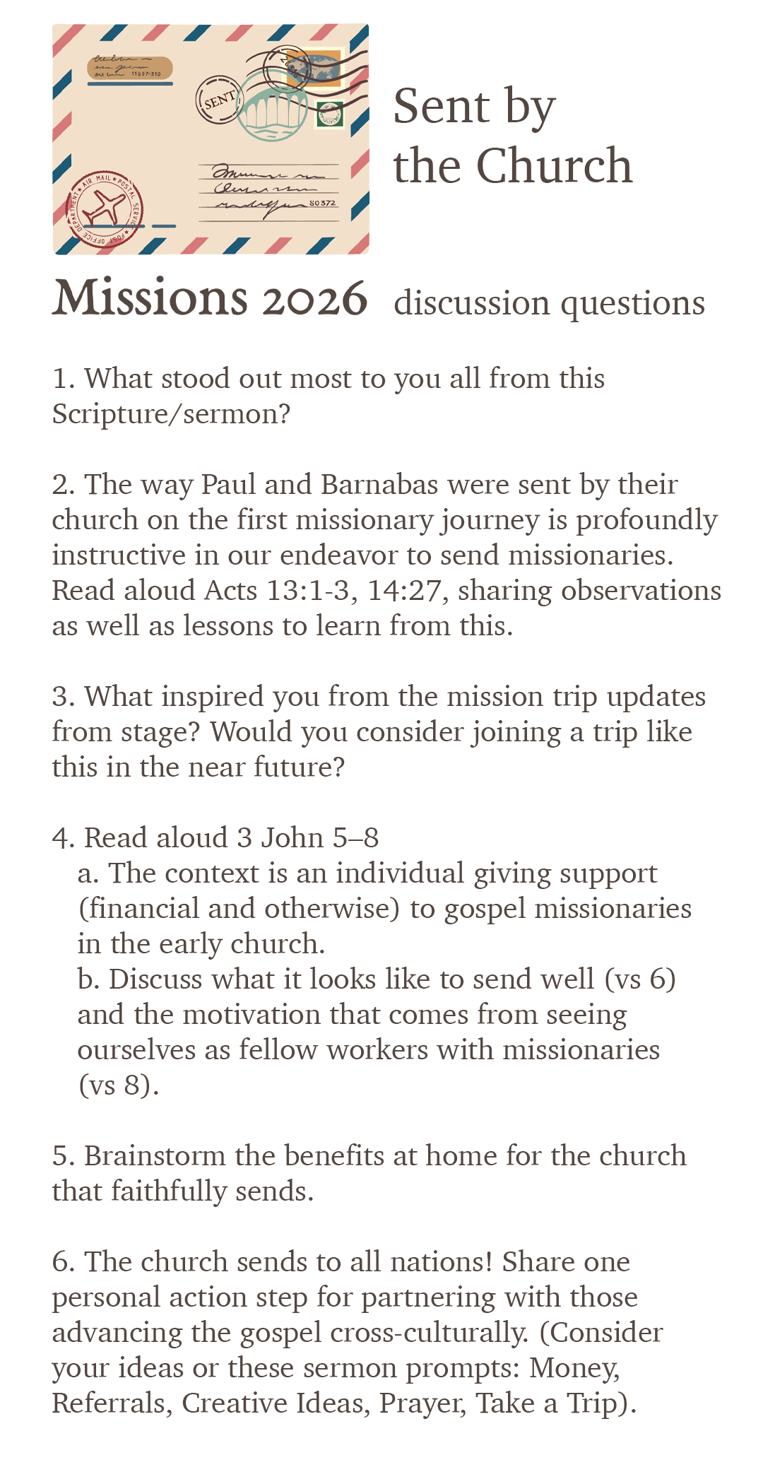The way Paul and Barnabas were sent by their church on the first missionary journey is profoundly instructive in our endeavor to send missionaries. Let’s hear updates from recent trips and inspirations for how we can both send and support missionaries well!