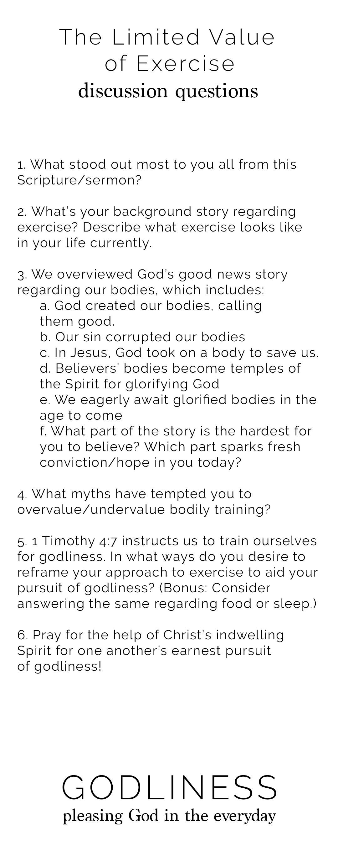 By default, we compartmentalize exercise from our pursuit of godliness. Let’s review God’s good news story regarding our bodies to discover the limited value of bodily training, and redirect exercise in aid of our training in godliness.
