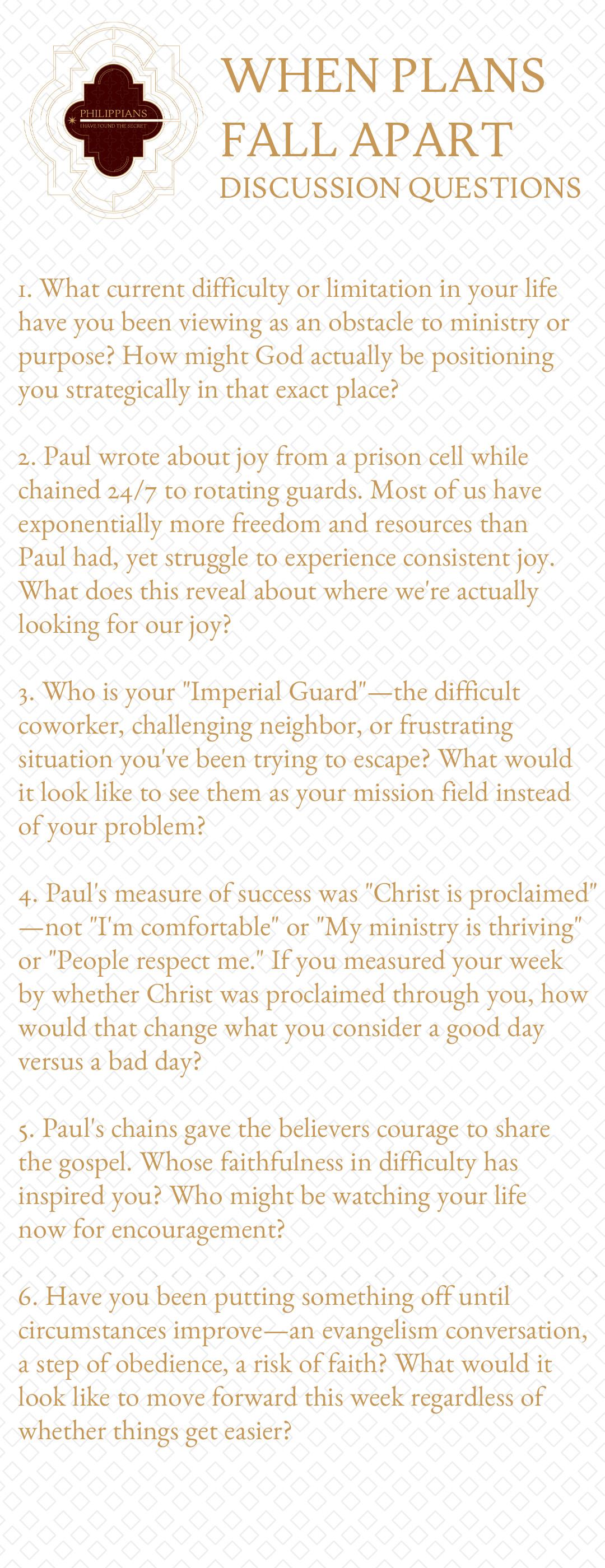 The Apostle Paul had ambitious plans for ministry, but his situation looked like total disaster when he ended up imprisoned. In Philippians 1:12-18, Paul reveals that God can use difficult circumstances to advance the gospel—and offers a glimpse of joy that circumstances can’t touch.
